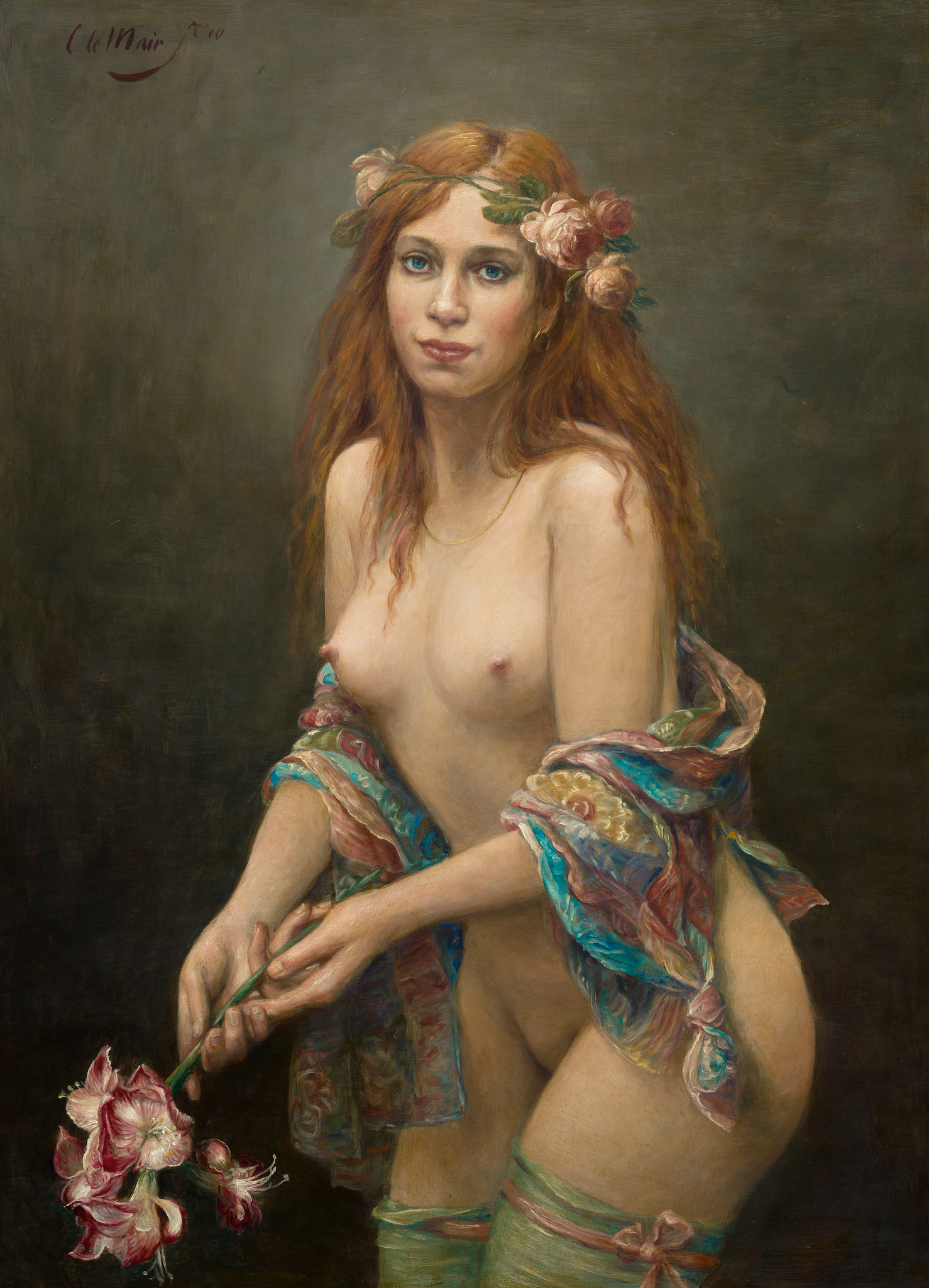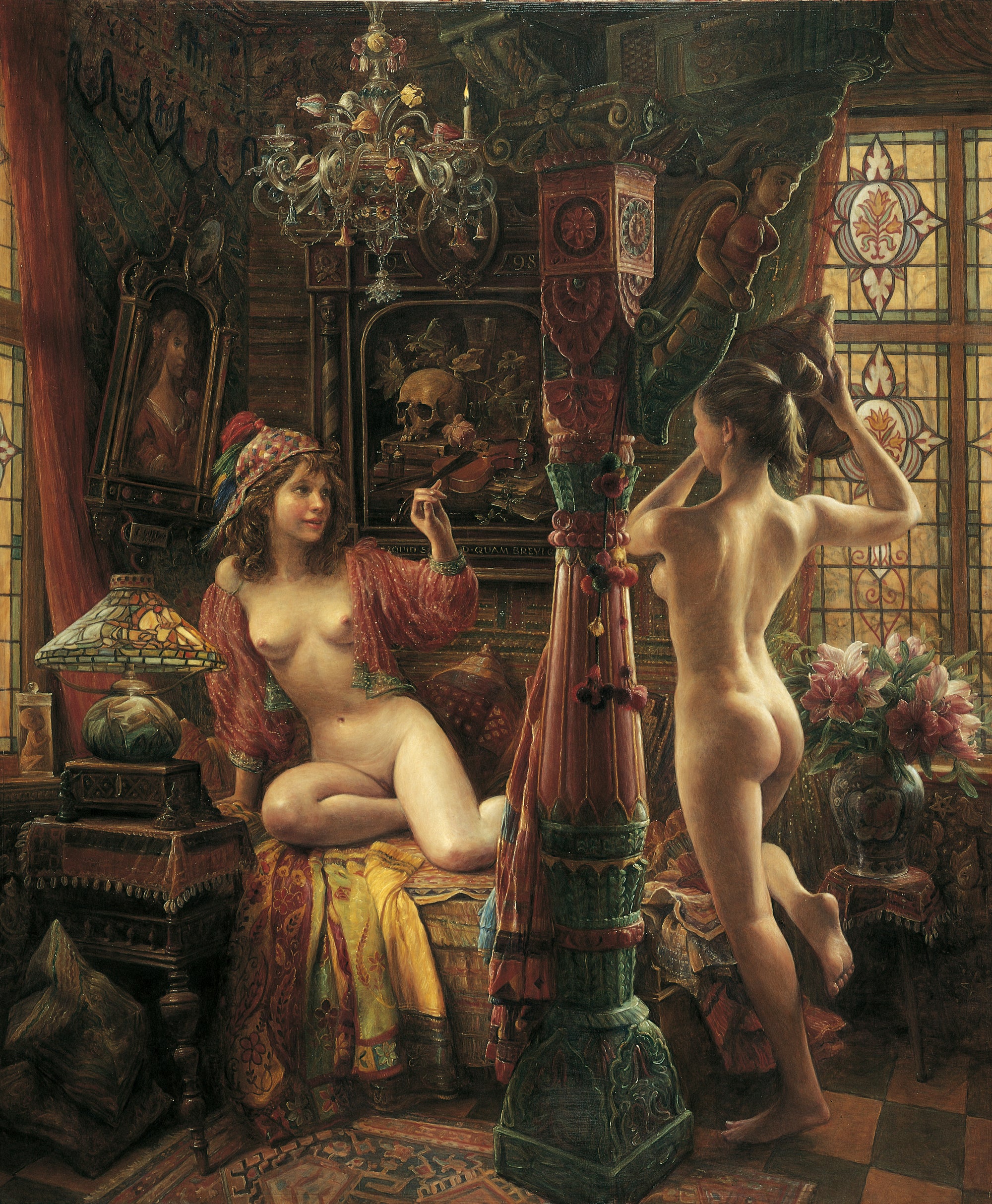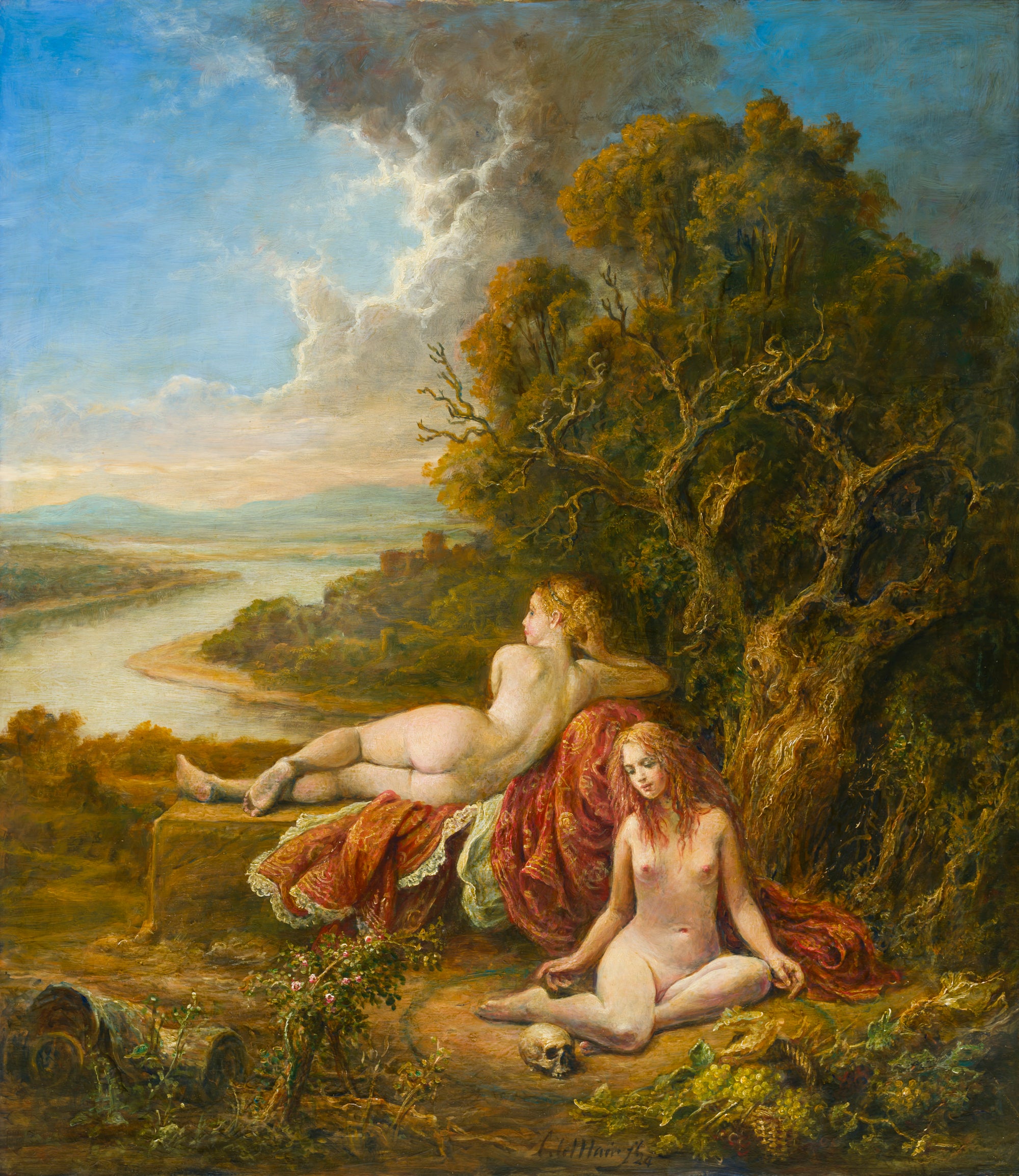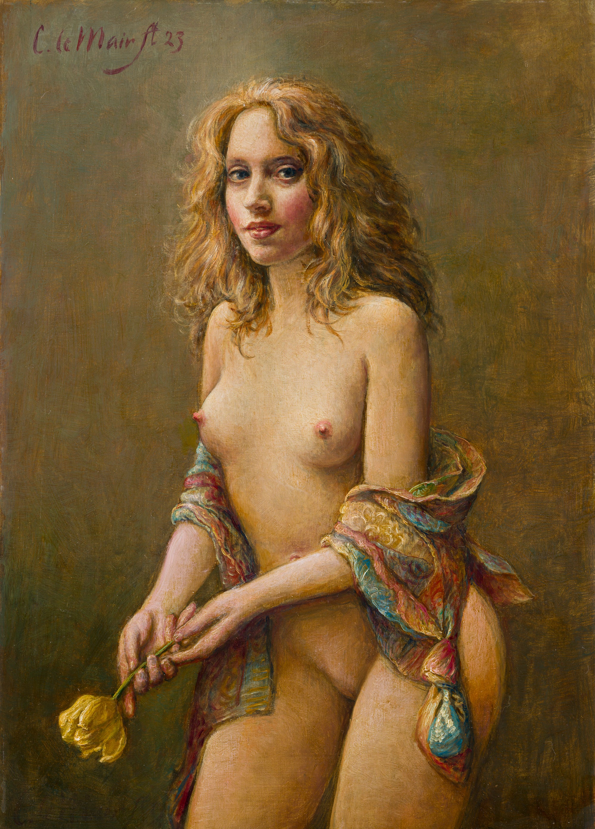Verdieping richting pastorale en mythische scènes: Leda en de zwaan (2020/21), Heksenkring en landschappen met ruïnes. (2024). Monumentale wolken, warm licht en figuren die schaal en tijd suggereren; het figuurstuk (Schildersmodel met gele tulp, 2023) behoudt portretmatige precisie binnen de klassieke model traditie.