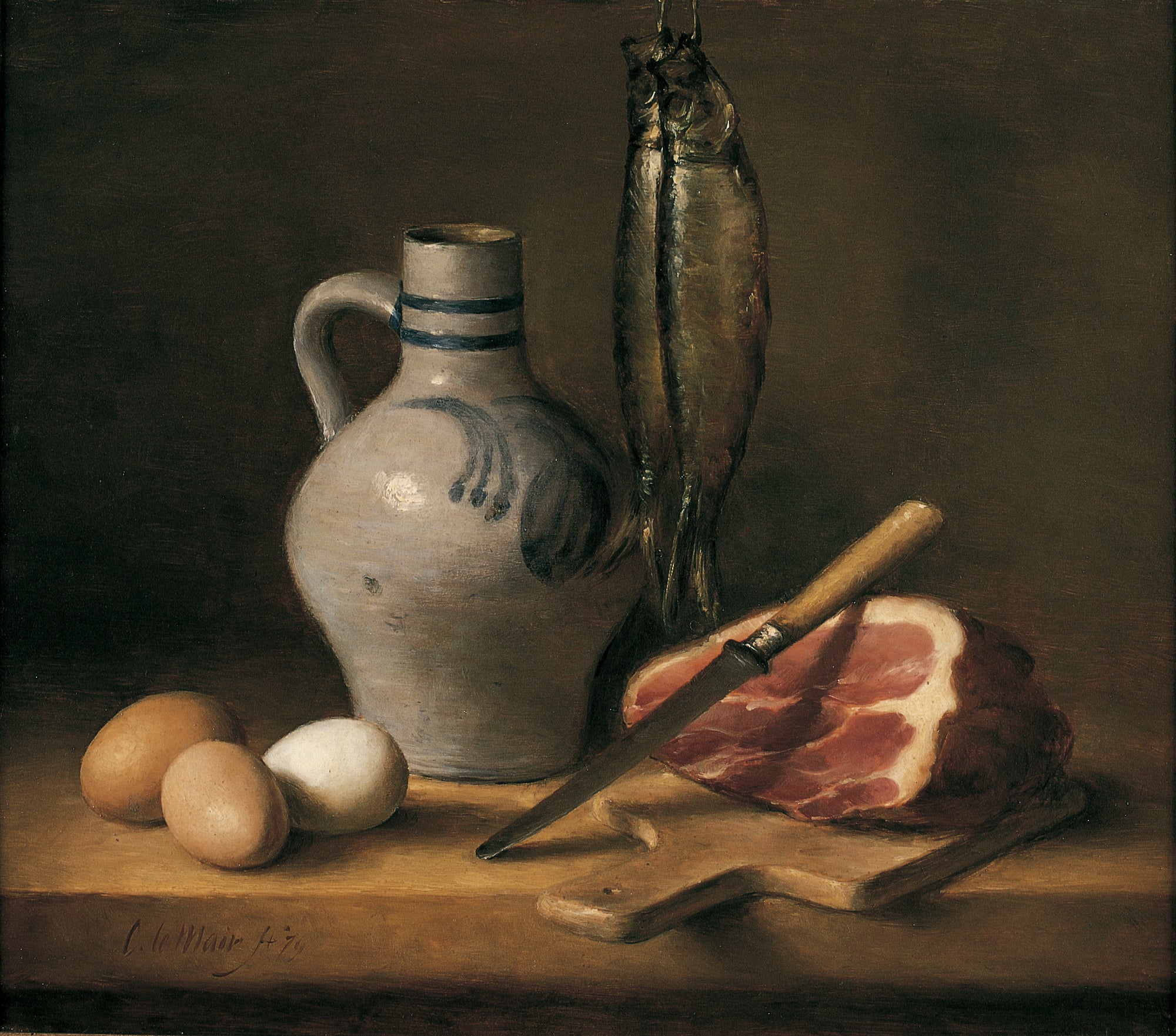 Van sober keukentafereel(kruik, ham, eieren, haring) naar rijk oosters porselein met fruitschaal en doek; het palet nog ingetogen.
