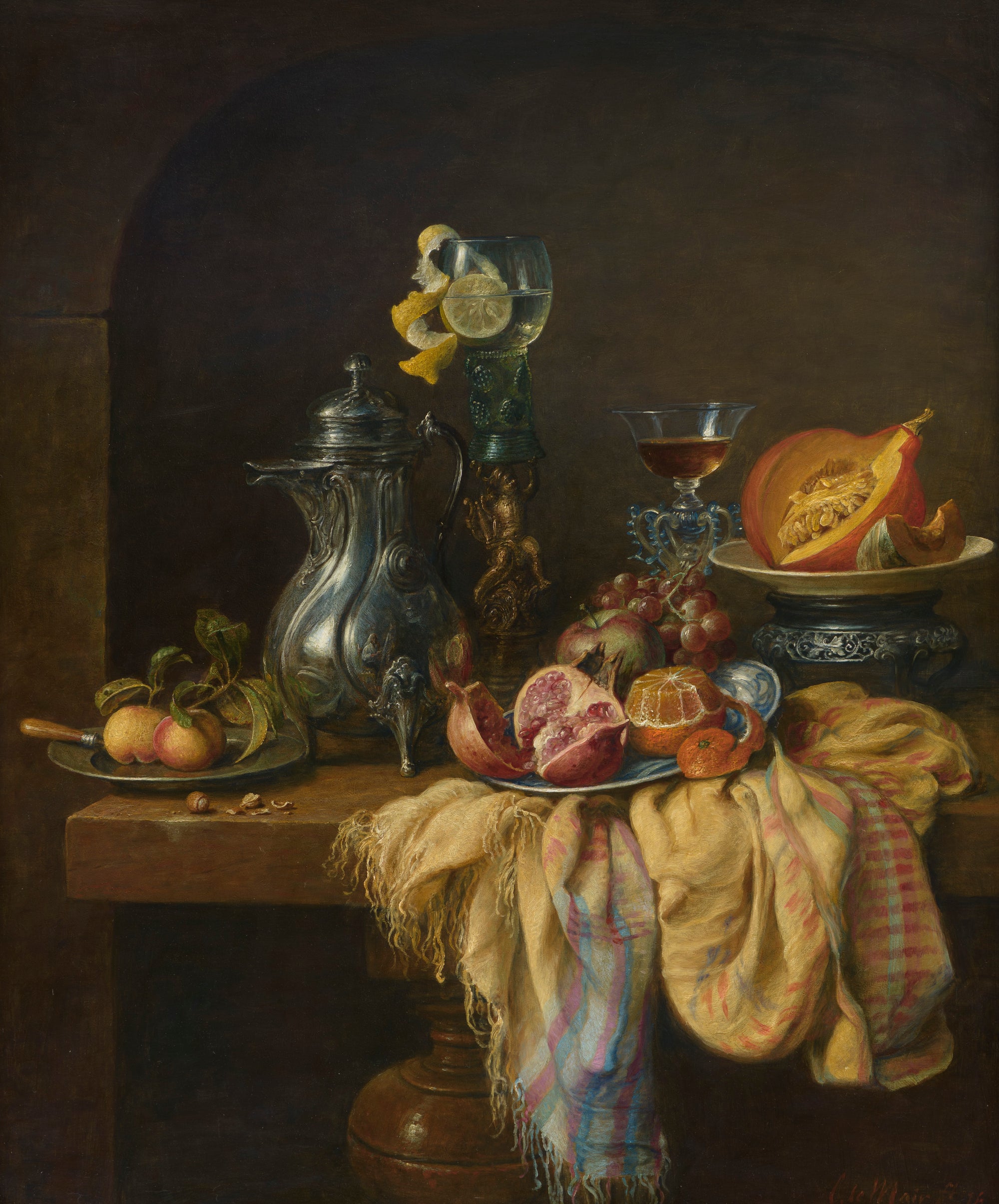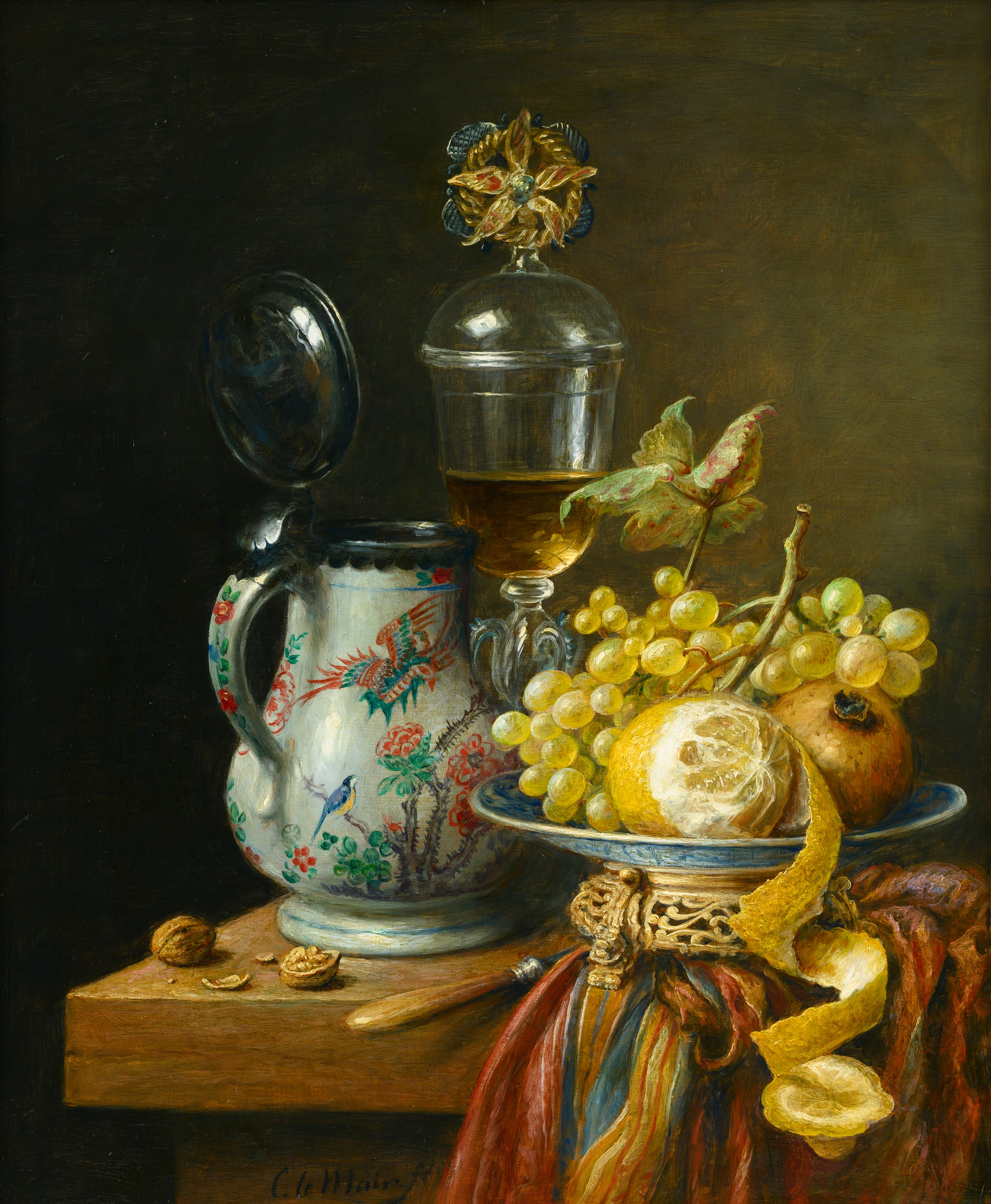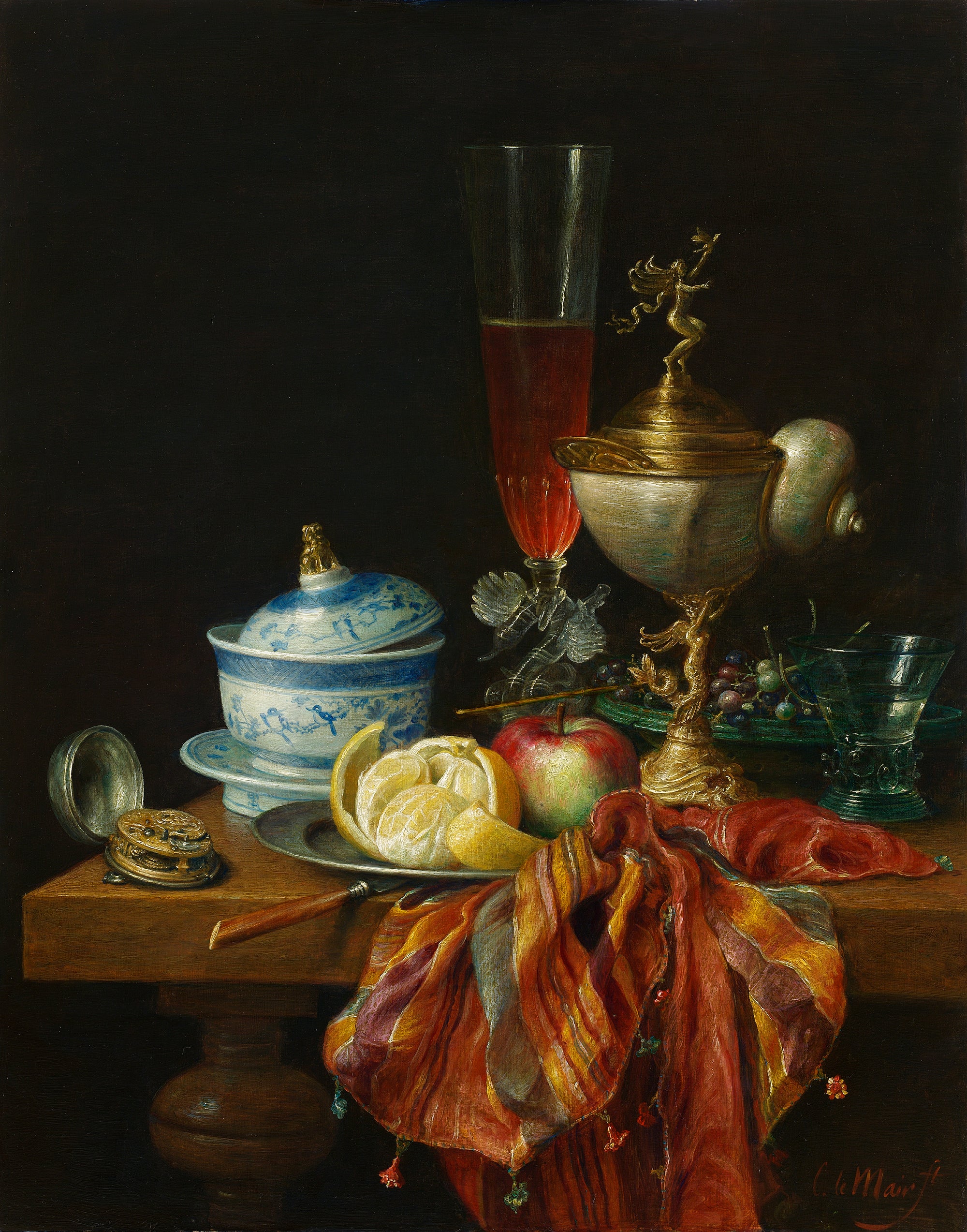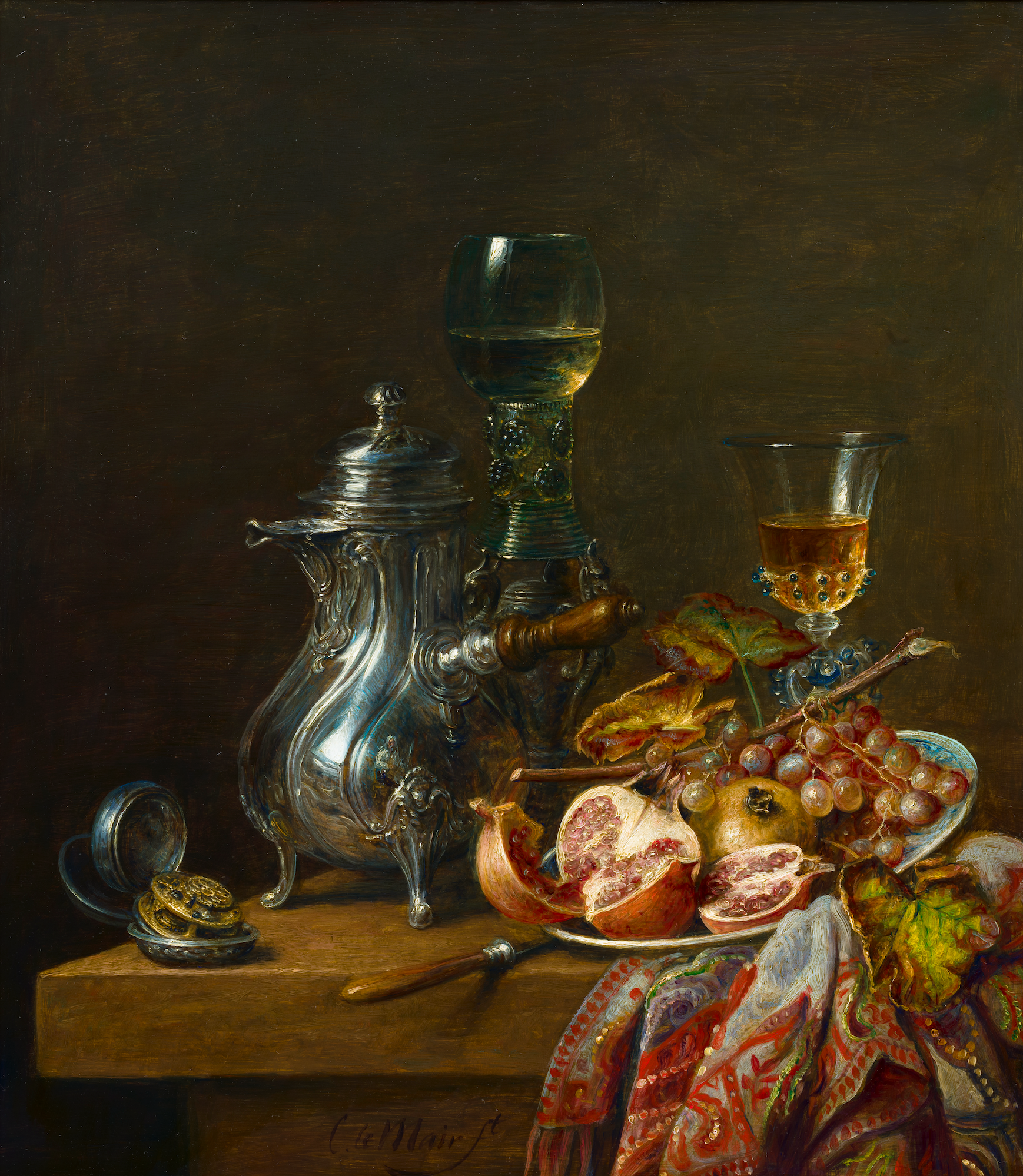 Hier blader je door zestig jaar stillevens. In de stillevens van Cornelis le Mair ontmoeten traditie en eigentijdse verfijning elkaar: kristalhelder glas, glanzend metaal, rijk textiel en fruit met tastbare frisheid, geordend in uitgebalanceerde composities en helder licht. Deze galerij toont de ontwikkeling van sober keukentafeltableau tot monumentaal pronkstilleven—een consistente handtekening in stofuitdrukking, kleur en tijdloze rust.