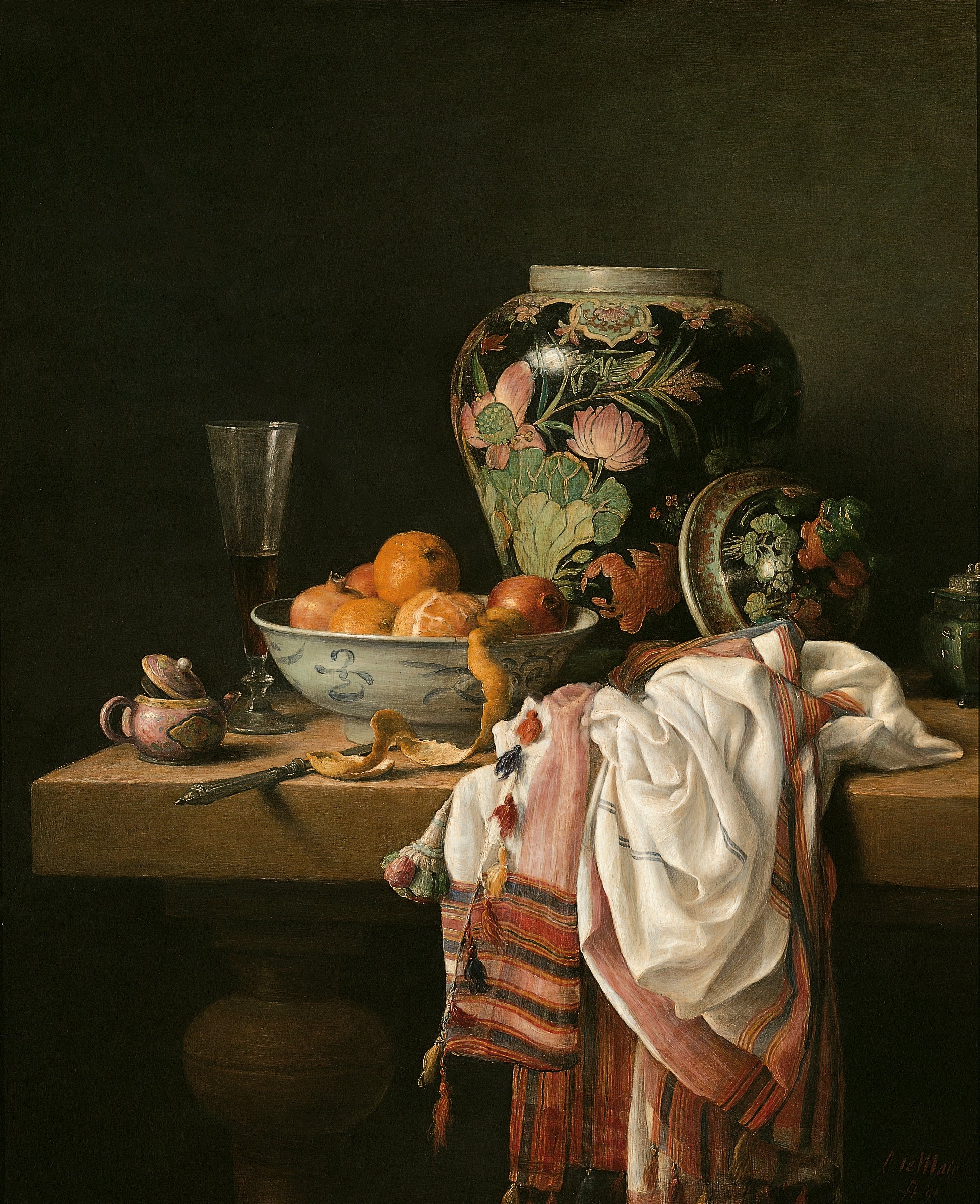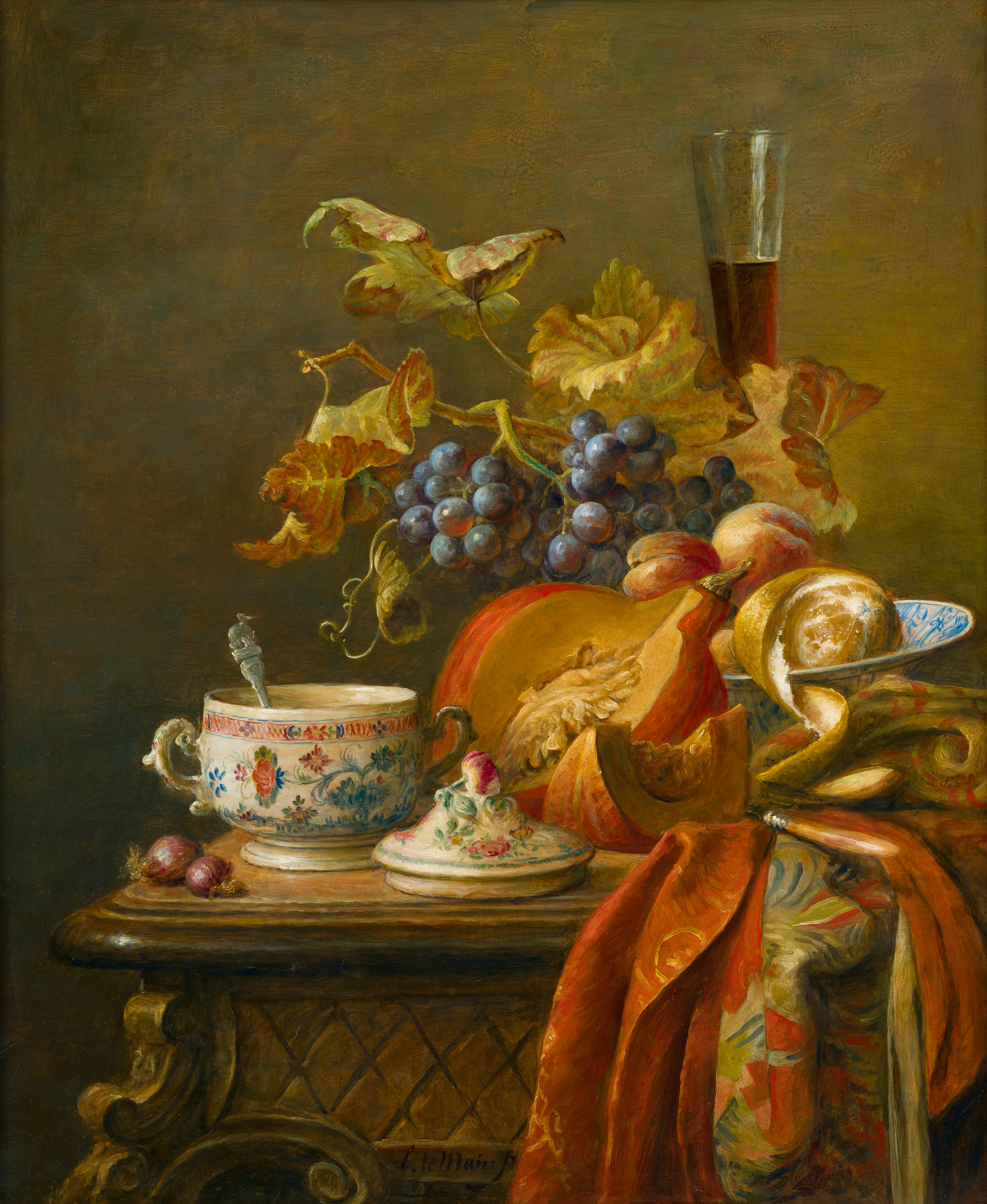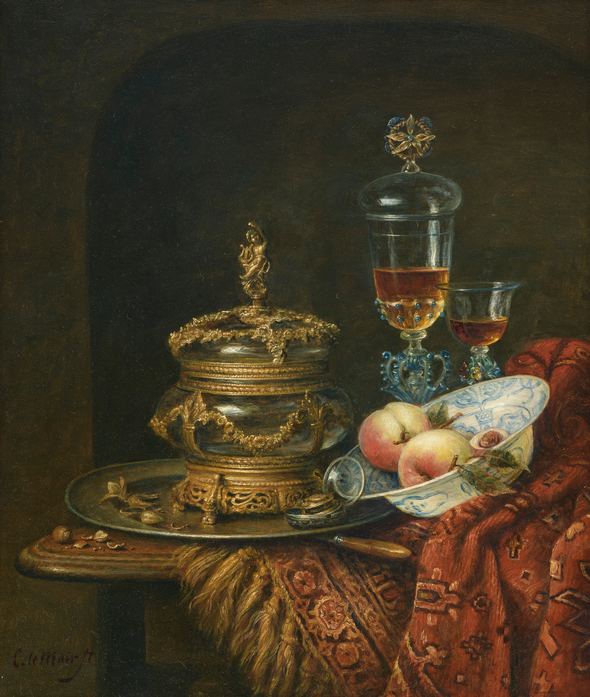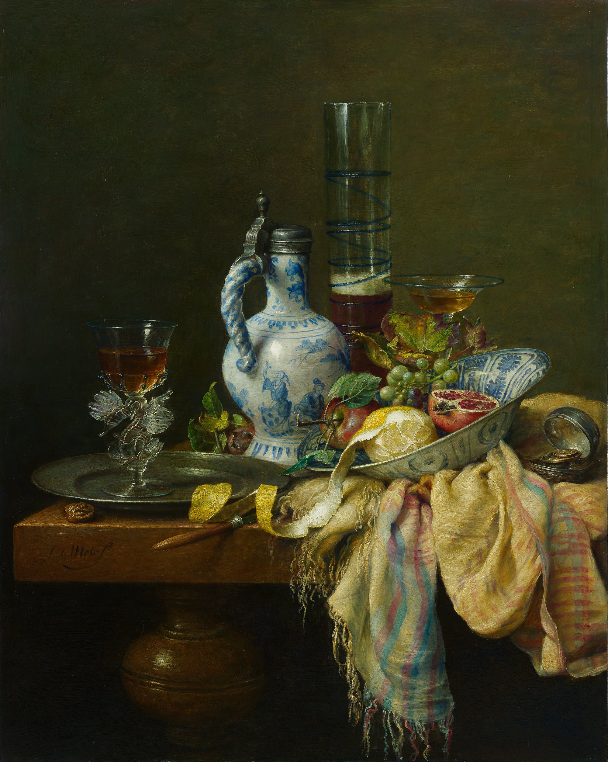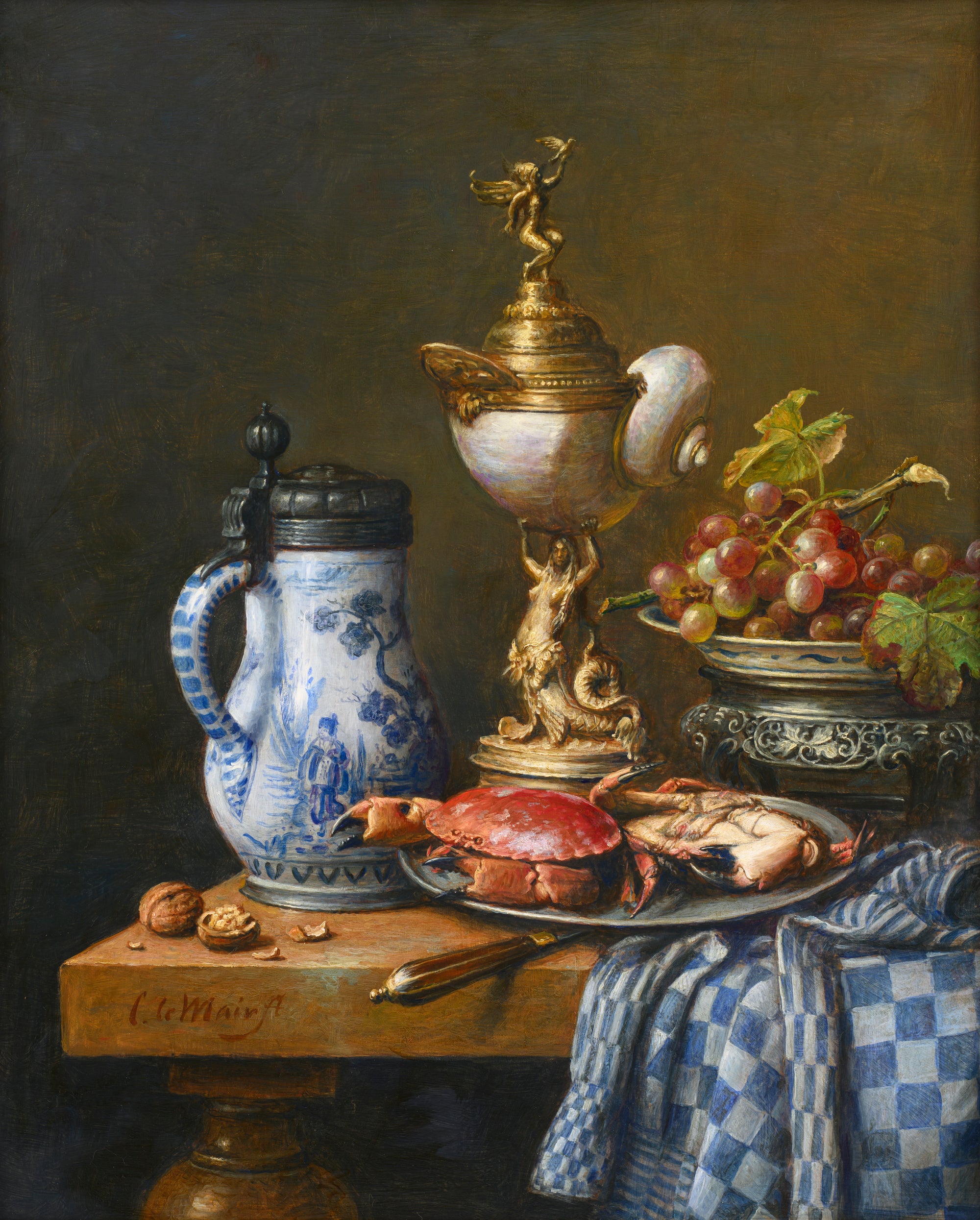 Hier blader je door zestig jaar stillevens. In de stillevens van Cornelis le Mair ontmoeten traditie en eigentijdse verfijning elkaar: kristalhelder glas, glanzend metaal, rijk textiel en fruit met tastbare frisheid, geordend in uitgebalanceerde composities en helder licht. Deze galerij toont de ontwikkeling van sober keukentafeltableau tot monumentaal pronkstilleven—een consistente handtekening in stofuitdrukking, kleur en tijdloze rust.
