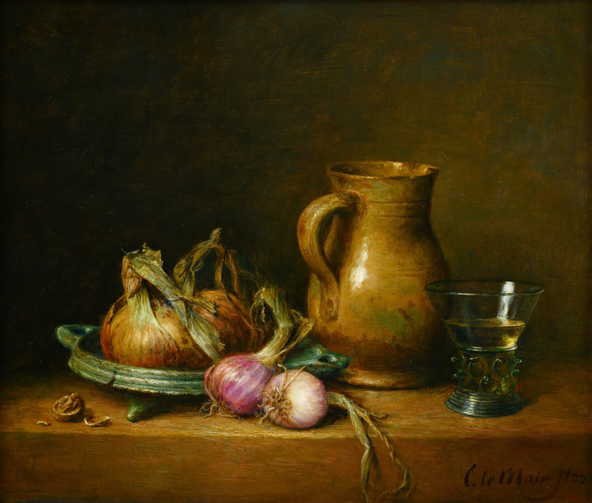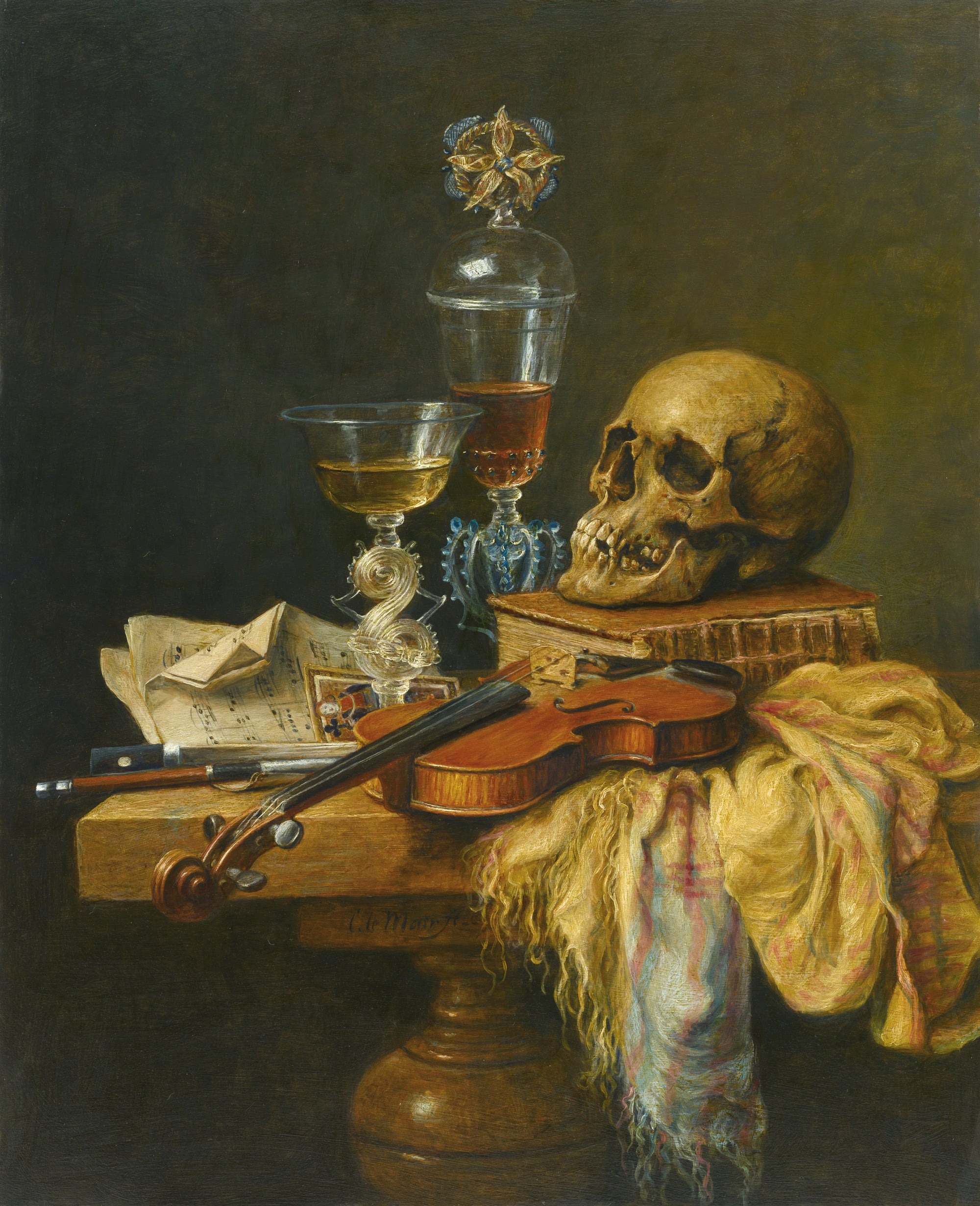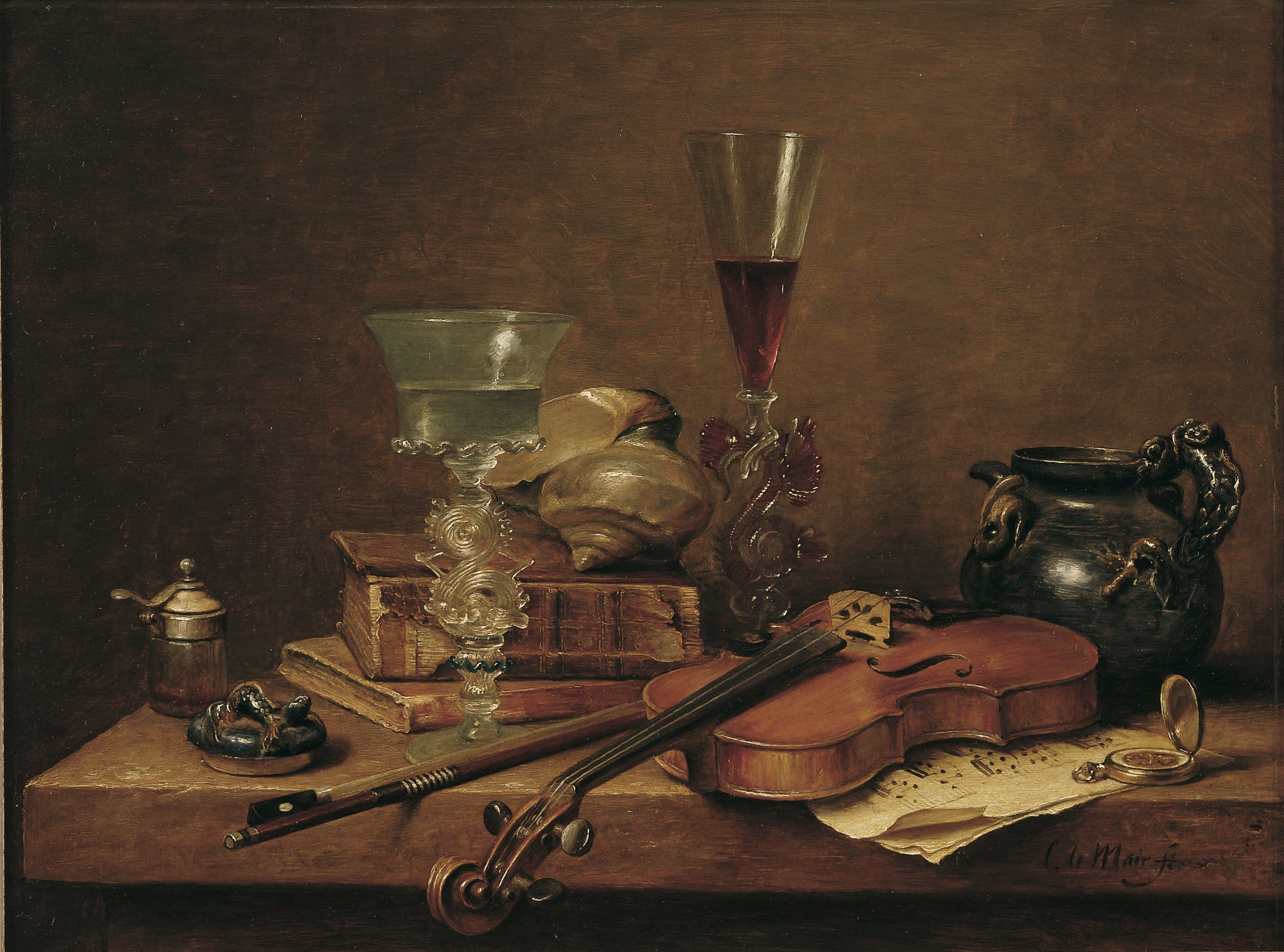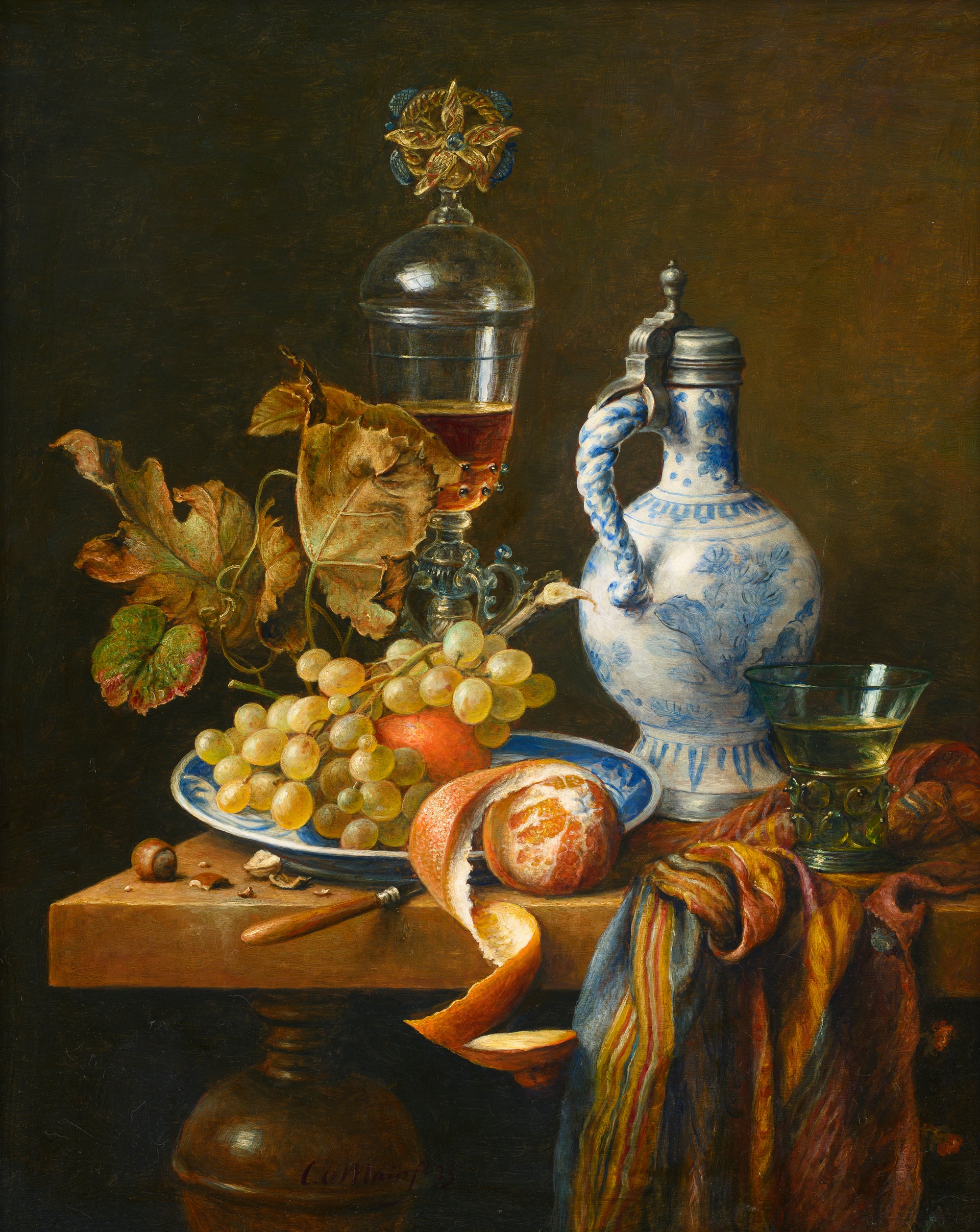 Hier blader je door zestig jaar stillevens. In de stillevens van Cornelis le Mair ontmoeten traditie en eigentijdse verfijning elkaar: kristalhelder glas, glanzend metaal, rijk textiel en fruit met tastbare frisheid, geordend in uitgebalanceerde composities en helder licht. Deze galerij toont de ontwikkeling van sober keukentafeltableau tot monumentaal pronkstilleven—een consistente handtekening in stofuitdrukking, kleur en tijdloze rust.