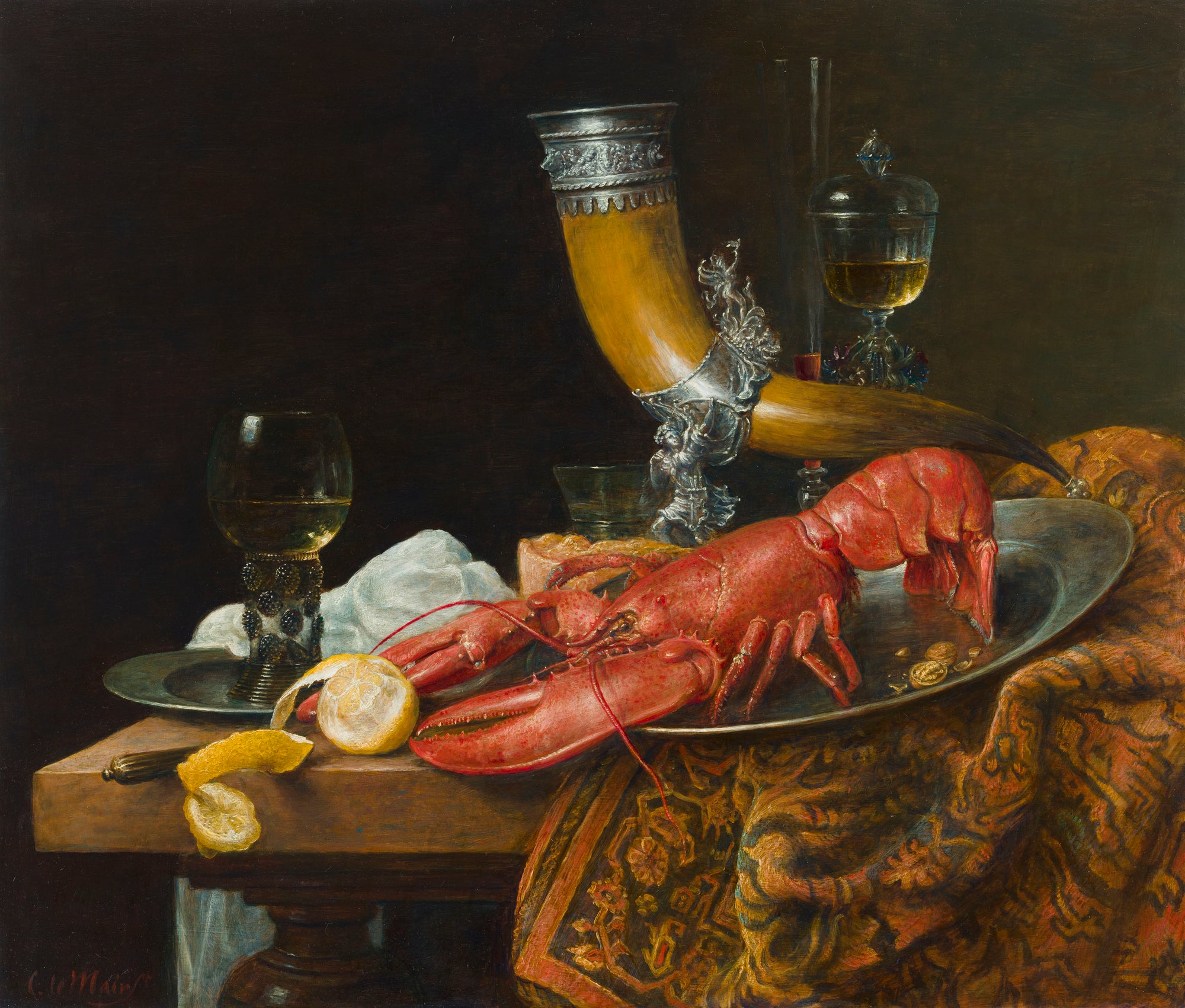 Van virtuoze Venetiaanse glazen, viool en schelpbekers via een japonaiserie-uitstap naar monumentale stukken met zilver, granaatappel en pompoen—geculmineerd in de kreeft met drinkhoorn (naar W. Kalf).