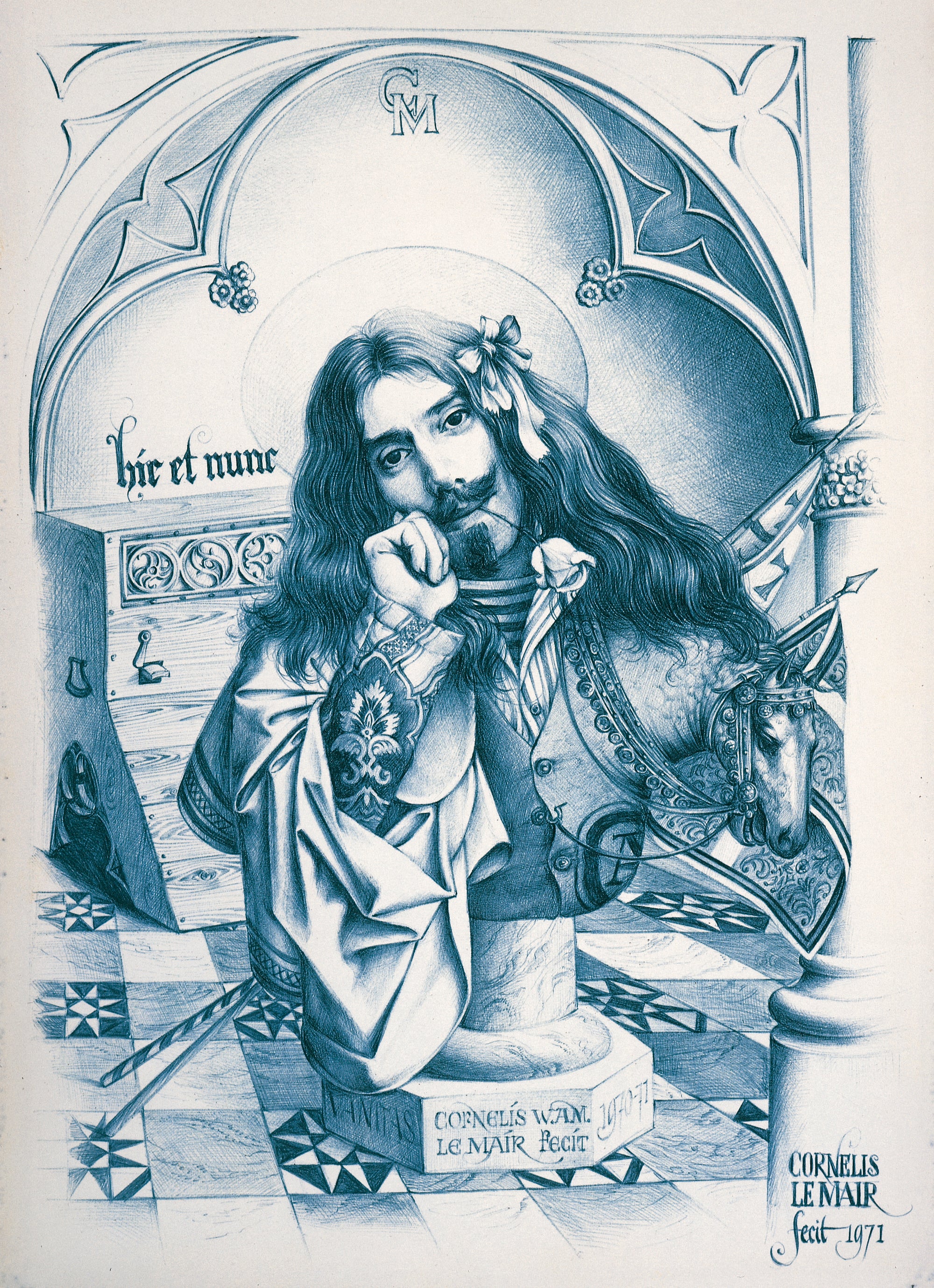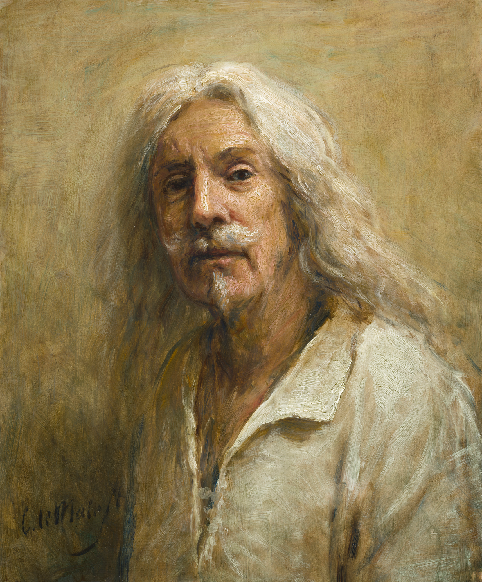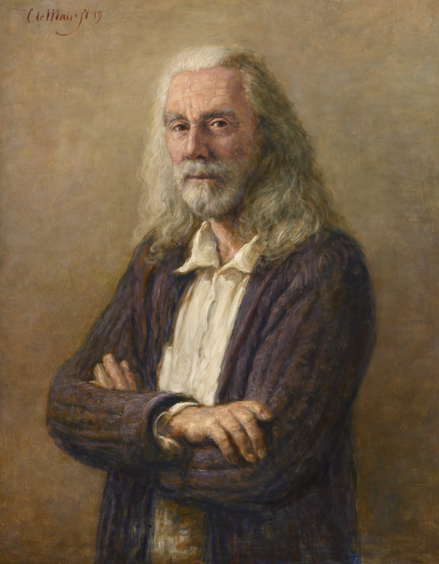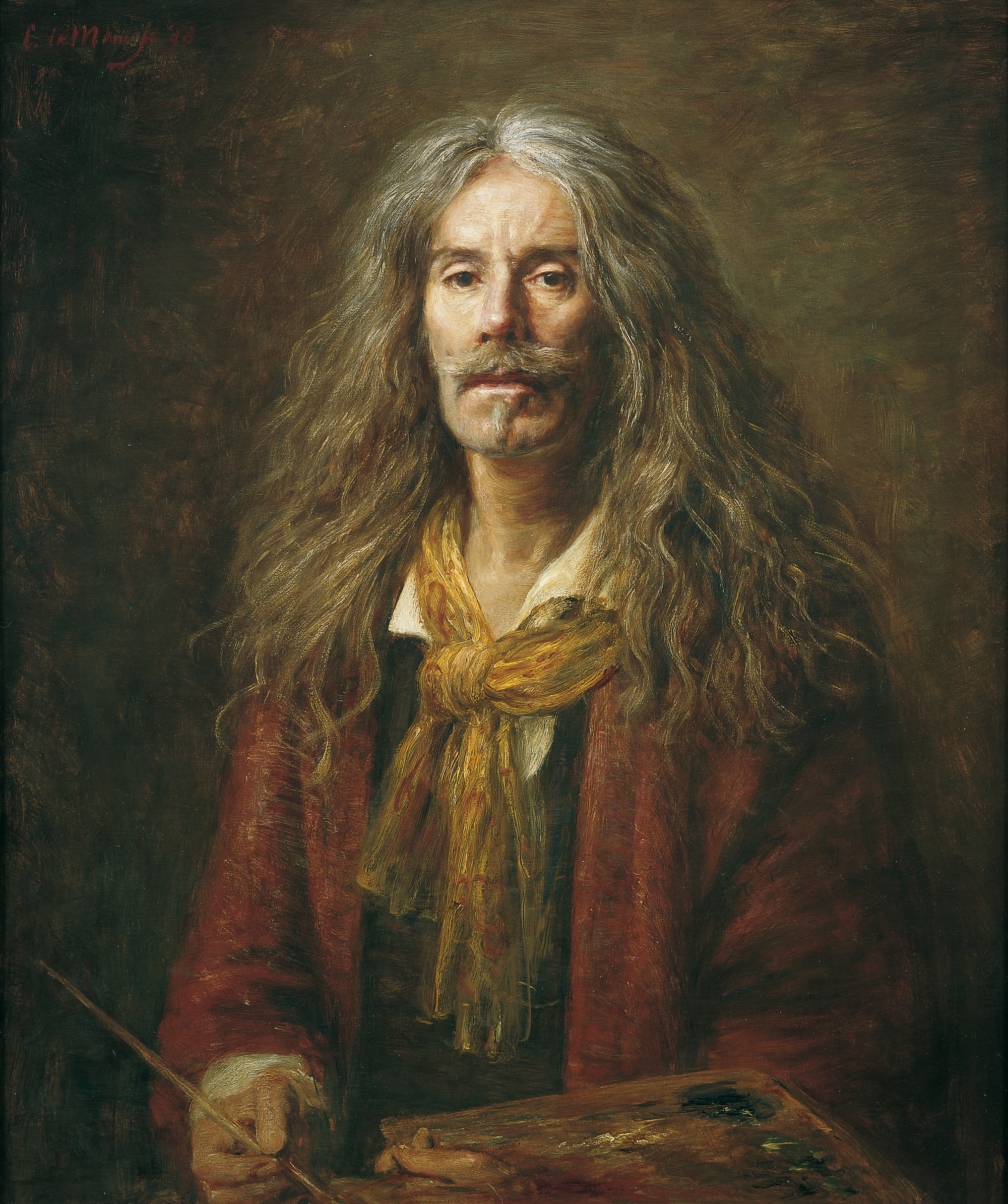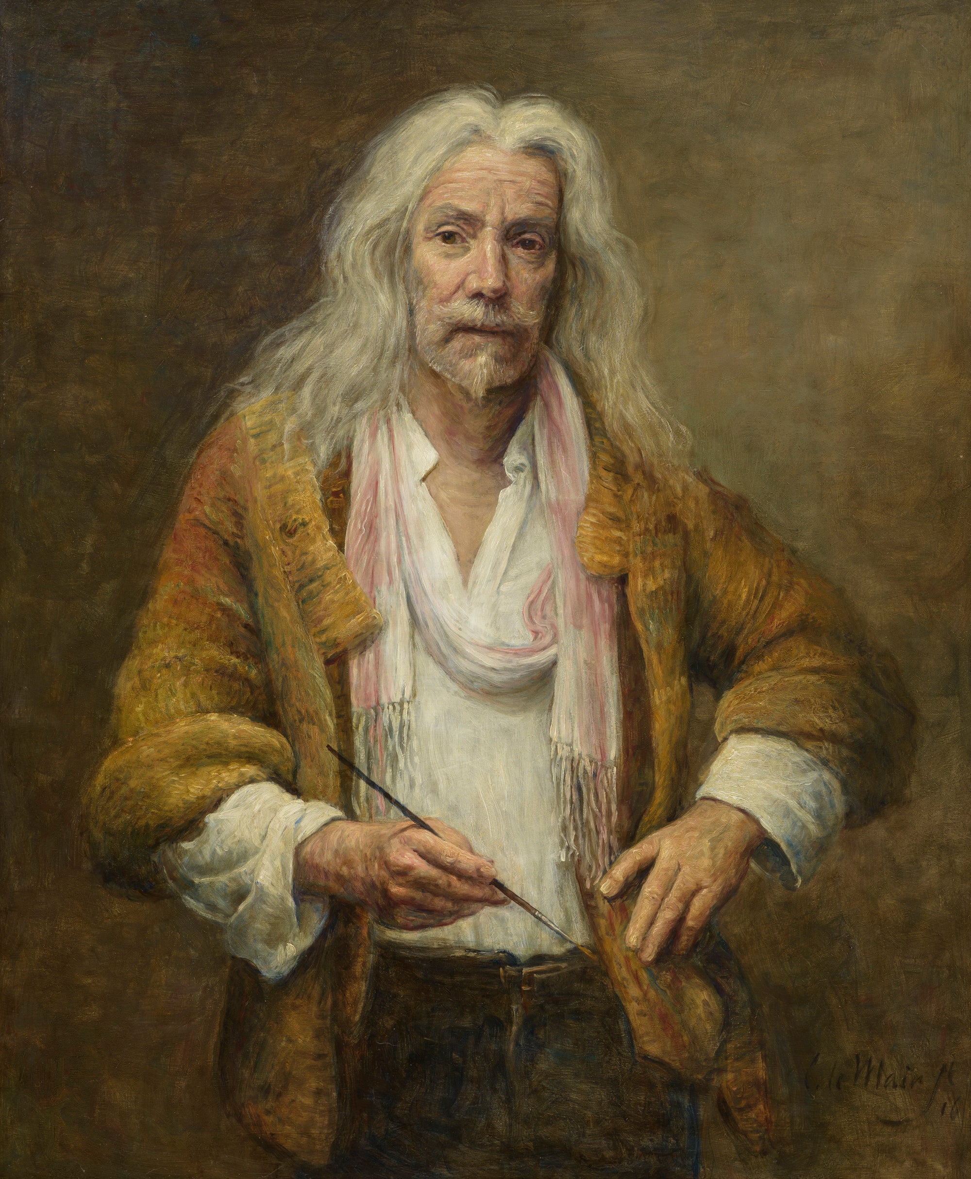 Hier blader je door zestig jaar zelfportretten. Le Mair’s zelfportretten tonen een constante klassieke signatuur. Licht-donkerregie, aardetinten, precieze stofuitdrukking met een duidelijke verfijning in kadrering en techniek. Van compacte, donkere studies via halffiguren met ambachtsiconen tot meer variatie in houding.